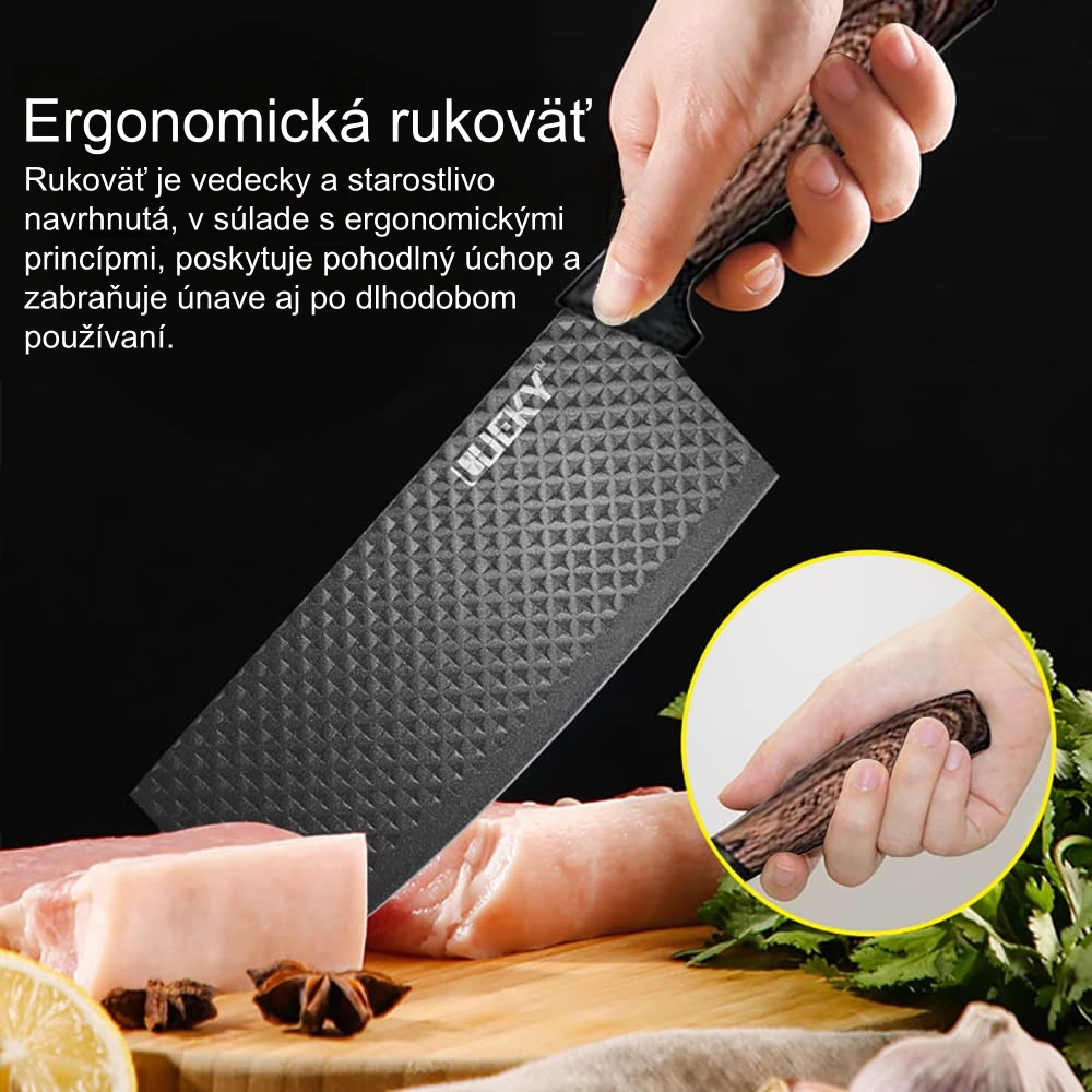 Rukoväte z farebného dreva sú ergonomicky tvarované, protišmykové a pohodlné na uchopenie. Vyváženie medzi rukoväťou a čepeľou znižuje únavu ruky aj pri dlhšej práci v kuchyni.